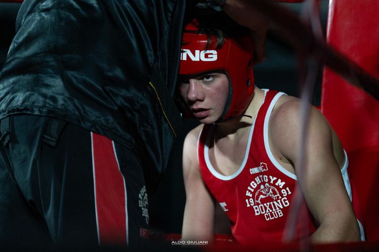 Grillo Giuseppe Under 19 (Medaglia d’Oro) batte ai punti Corridori Andrea Under 17 (Fight Gym) in 3 round di 2′.