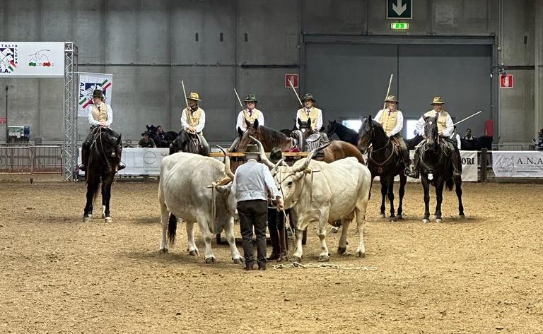 La Maremma, com’è nello stile dei butteri, è stata rappresentata a 360°: sulla pista di Verona c’erano cavalli maremmani, un carro agricolo, vacche maremmane e giovanissime puledre maremmane.