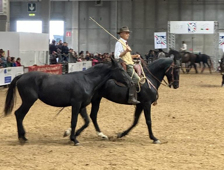 L’esibizione, cominciata con le puledre incapezzate, si è trasformata in magia quando i cavalieri hanno deciso di liberarle. Non è cambiato nulla: trotto, incroci, veroniche e scambi da fermo perché «quando la fiducia è conquistata – continua il buttero – non ci sono più limiti e si può chiedere ai propri cavalli anche quello che sembra impossibile».