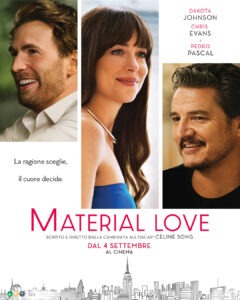 Material love (Usa 2025, commedia, sentimentale, durata 109 minuti). Regia di Celine Song. Attori: Dakota Johnson, Pedro Pascal, Chris Evans, Marin Ireland, Sawyer Spielberg, Lindsey Broad, Louisa Jacobson, Dasha Nekrasova, Halley Feiffer, Will Fitz, Zoe Winters, Nedra Marie Taylor. Distribuito da Eagle Pictures, sceneggiatura di Celine Song, fotografia di Shabier Kirchner, montaggio di Keith Fraase, musiche di Daniel Pemberton, prodotto da A24, 2AM, Killer Films