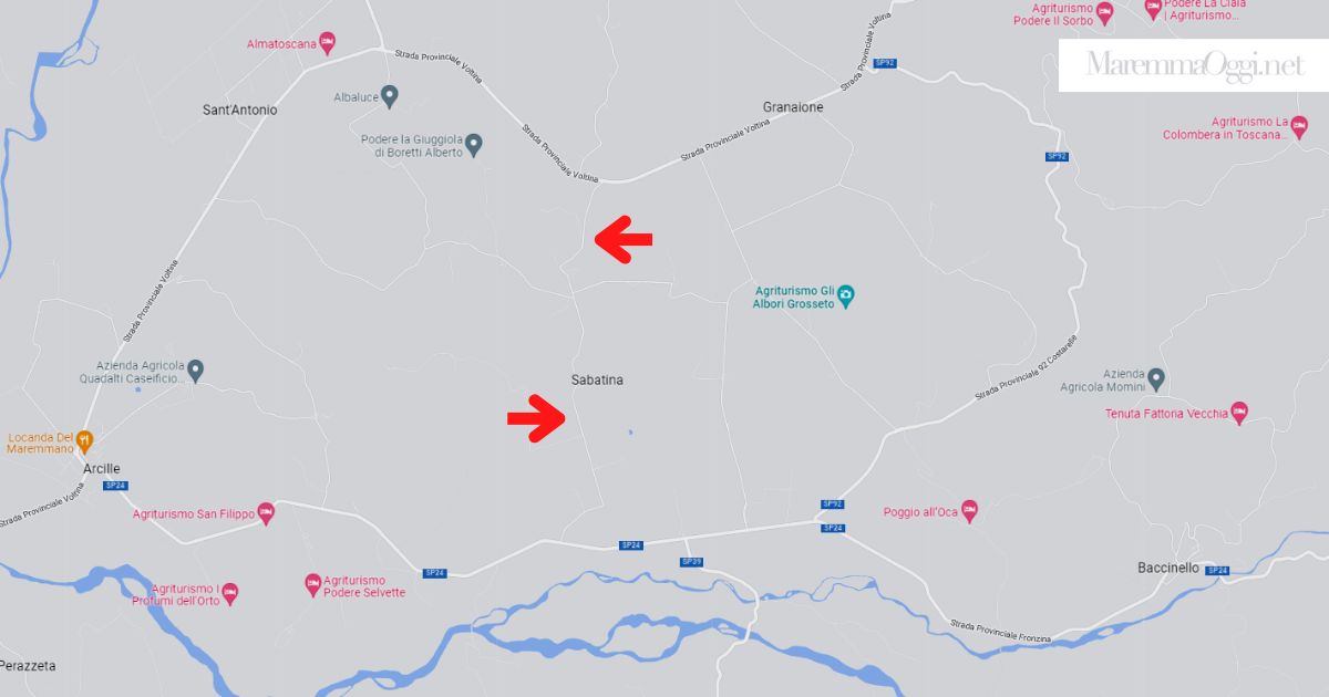 La Sabatina è una strada provinciale, circa 3,5 km, che collega altre due strade provinciali, la Fronzina e la Voltina: siamo nel comune di Campagnatico, fra Arcille e Baccinello da una parte, fra Sant’Antonio e Granaione dall’altra. In mezzo c’è il piccolo abitato di Sabatina, con la fattoria, qua e là alcuni poderi e aziende agricole. Un paradiso in Maremma.