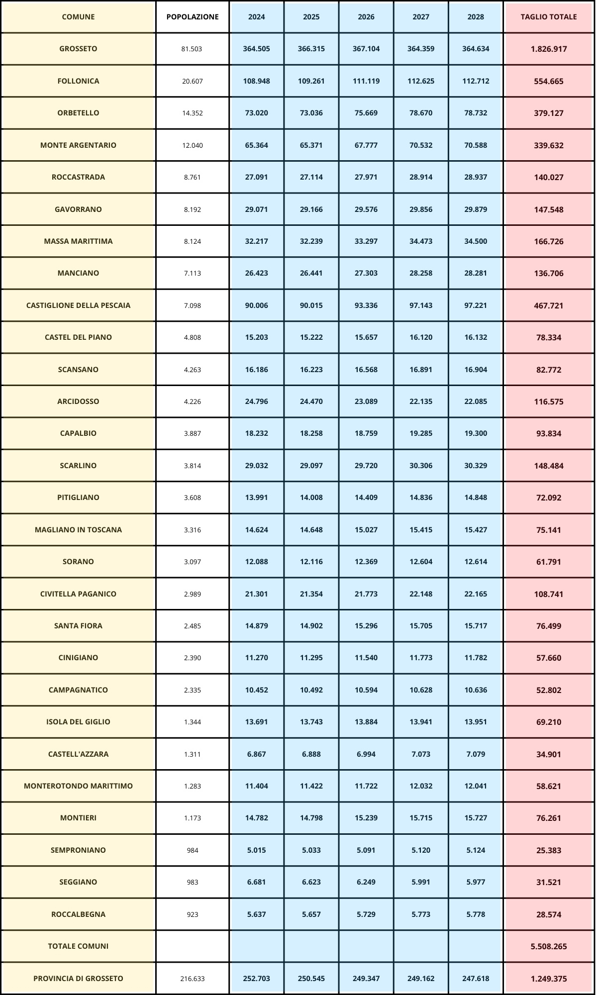 Questa la tabella completa dei tagli previsti dal governo Meloni ai Comuni della Maremma e alla Provincia.