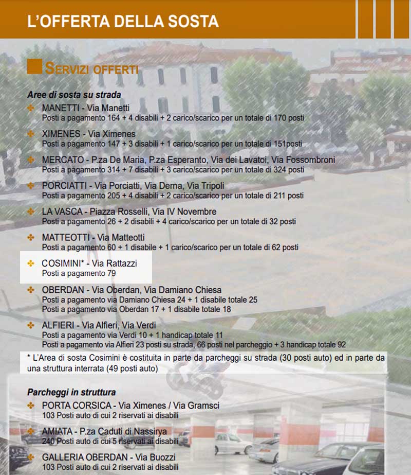 La stessa carta dei parcheggi a pagamento della città di Grosseto, realizzata prima da Grosseto Parcheggi (società creata nel 2003 per la gestione, appunto, dei parcheggi a pagamento della città) e poi da Sistema, con cui la stessa Grosseto Parcheggi si è fusa nel 2013, riporta il parcheggio Cosimini fra quelli a disposizione.