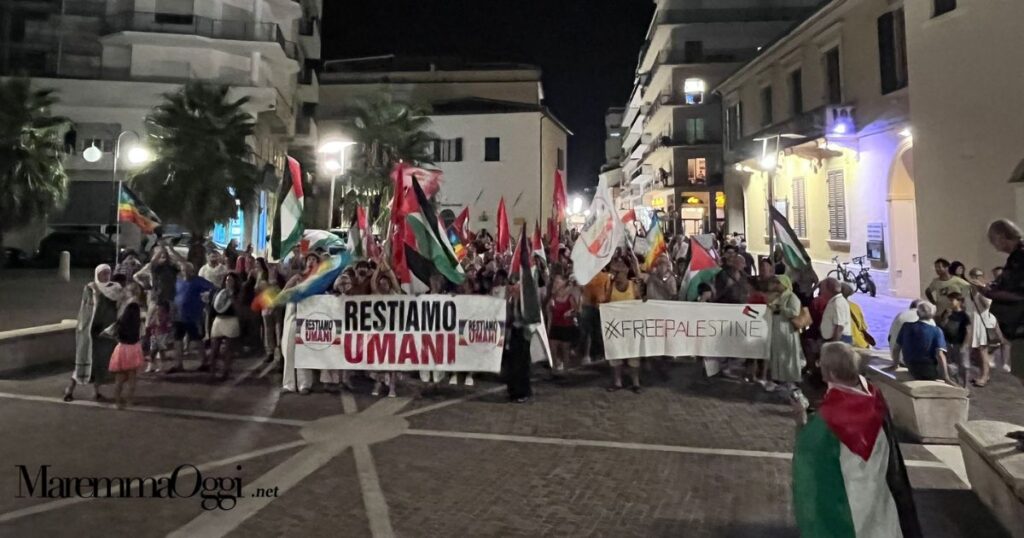 FOLLONICA. In 500 hanno partecipato alla manifestazione di ieri sera, 17 agosto, organizzata a Follonica dall’associazione “Restiamo Umani“, per denunciare il genocidio che sta subendo il popolo palestinese a Gaza e per rompere il silenzio sulla grave situazione umanitaria in corso. L’evento ha raccolto l’invito alla campagna “Disertiamo il silenzio” creata da Tomaso Montanari, storico dell’arte e rettore dell’Università per stranieri di Siena, a cui ha aderito anche l’Anpi provinciale.