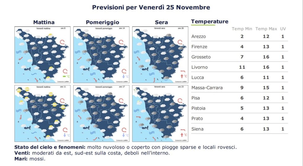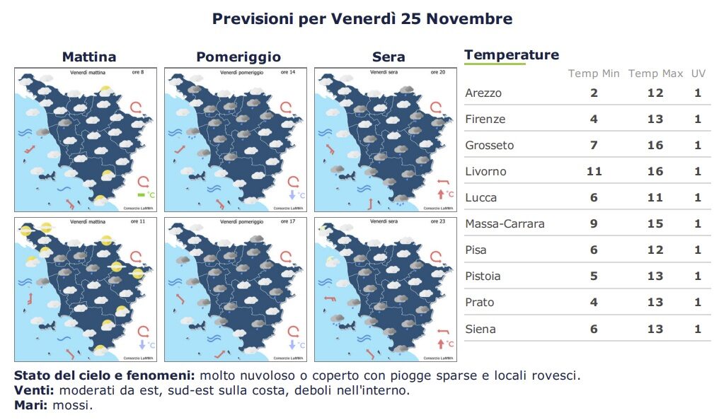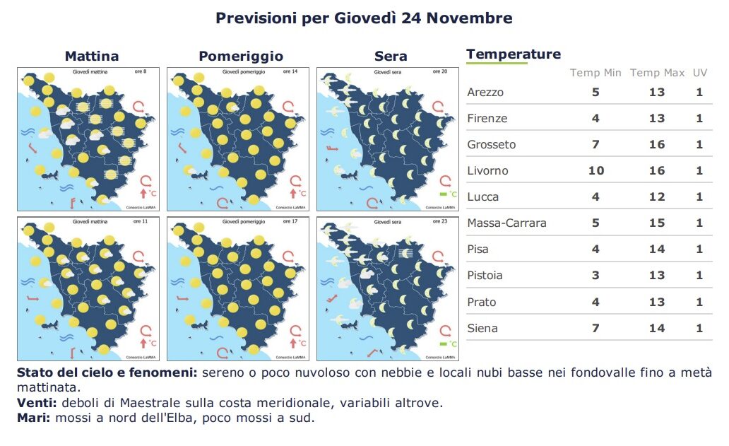 Dopo le abbondanti piogge di inizio settimana, le nuvole e le piogge sparse che oggi, 23 novembre, stanno interessando il sud della provincia, giovedì si prevede una giornata in netto miglioramento, con tempo sereno o poco nuvoloso, con venti di maestrale. Attenzione alla nebbia nelle vallate e nelle zone pianeggianti. Da venerdì tornano le nubi e le precipitazioni, mentre da sabato pomeriggio è previsto il miglioramento, che prosegue nella giornata di domenica.