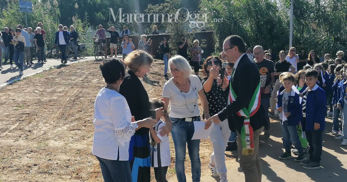 FOLLONICA. Il ponte ciclopedonale collegherà il Parco centrale a via della Pace e al quartiere Cassarello, passando sopra la Gora delle Ferriere. Il sindaco Andrea Benini e la giunta oggi, 7 ottobre, hanno presenziato alla cerimonia del taglio del nastro. Insieme a loro c’erano gli alunni degli istituti Leopoldo di Lorena, la II A e B don Milani, le terze A B C, la V A di via Buozzi e la III B Bugiani, insieme ai docenti e a moltissimi cittadini.