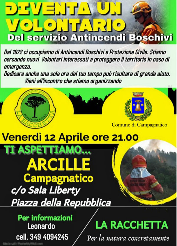 ARCILLE. La Racchetta e il Comune di Campagnatico incontrano i cittadini, con l’obiettivo di sensibilizzare la popolazione e trovare nuovi volontari. L’obiettivo è aprire un distaccamento a Campagnatico, per essere più tempestivi negli interventi in caso di emergenza.