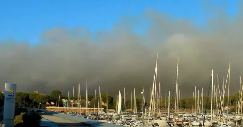 Le prime nuvole nere di fumo si vedevano bene dalla spiaggia, dietro alle case. Il vento di mare portava via l’odore di bruciato, ma intorno alle 16 l’orizzonte aveva i colori cupi del nero e del rosso, il cielo quasi totalmente oscurato dal fumo.