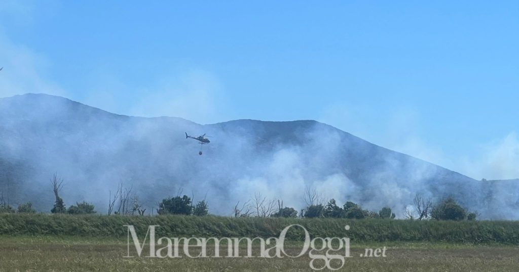 La zona interessata dall’incendio è al di là dell’argine dell’Ombrone, nell’area che guarda alle colline del parco dell’Uccellina.