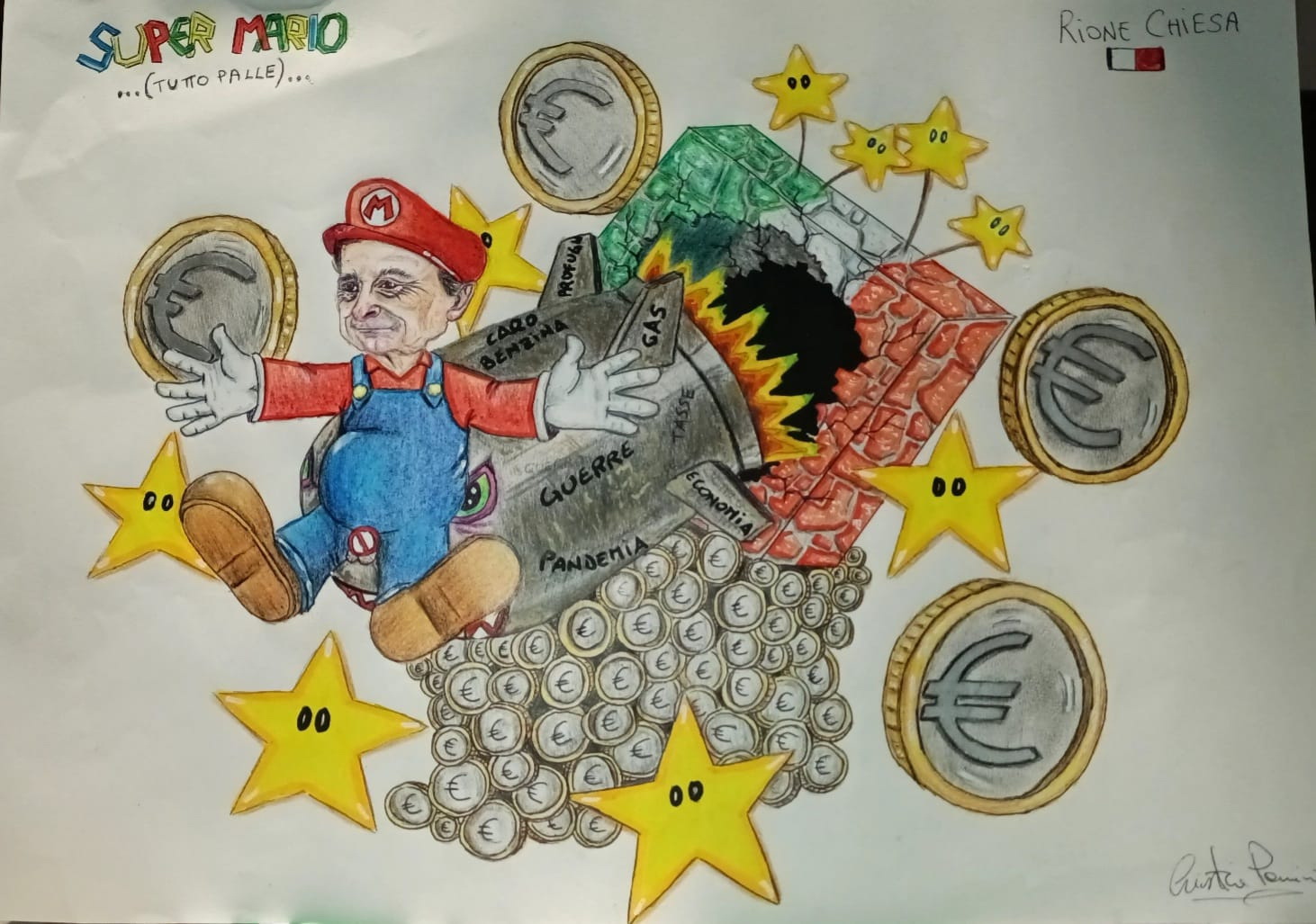 Un carro di satira politica, più precisamente sull’ormai ex Presidente del consiglio Mario Draghi. Il carro immagina il nostro ex Presidente letteralmente silurato dall’Italia, qui rappresentata da un muro in pietra oramai pieno di crepe, a causa della mancata fiducia alla Camera dei Deputati. Fanno da contorno al carro gli elementi del famoso videogioco “Super Mario” come monete e stelle.