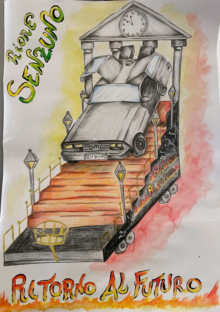 Il Rione vuole omaggiare uno dei film cult della cinematografia mondiale anni ’80, “Ritorno al Futuro”. Doc e Marty, i due protagonisti della pellicola del 1985 e di tutta la saga svettano sul carro alla guida della mitica DeLorean DMC-12. Costruita tutta a mano seguendo il progetto originale della vettura del film.