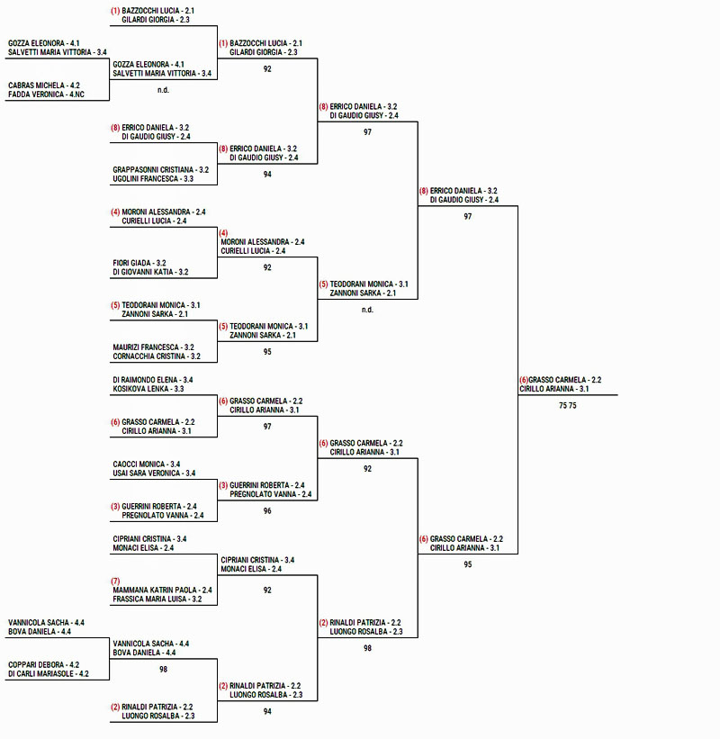 Nell’over 40 si fermano ai quarti la stessa Monaci (con Cristina Cipriani) e Alessandra Moroni con Lucia Curielli. Titolo a Grasso-Cirillo.