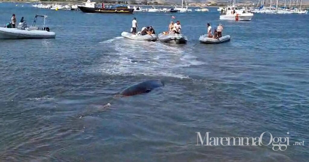 Per provare a farla uscire dal corpo sono stati necessari 3 gommoni, una barca della guardia costiera e un’imbarcazione da rimorchio. È contro la prassi legare la balenottera per spostarla, ma in questo caso era l’unico modo per provare a salvarla da una morte certa.