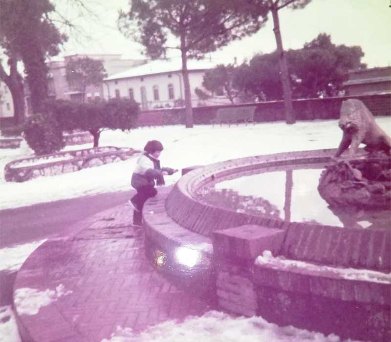 «Questa è l’unica foto che sono riuscita a trovare, io e mio fratello Massimo che aveva tre anni mentre io cinque. Mia mamma che è filippina non aveva mai visto la neve e quasi aveva paura, non ci ha fatto uscire ma solo una foto sul balcone».