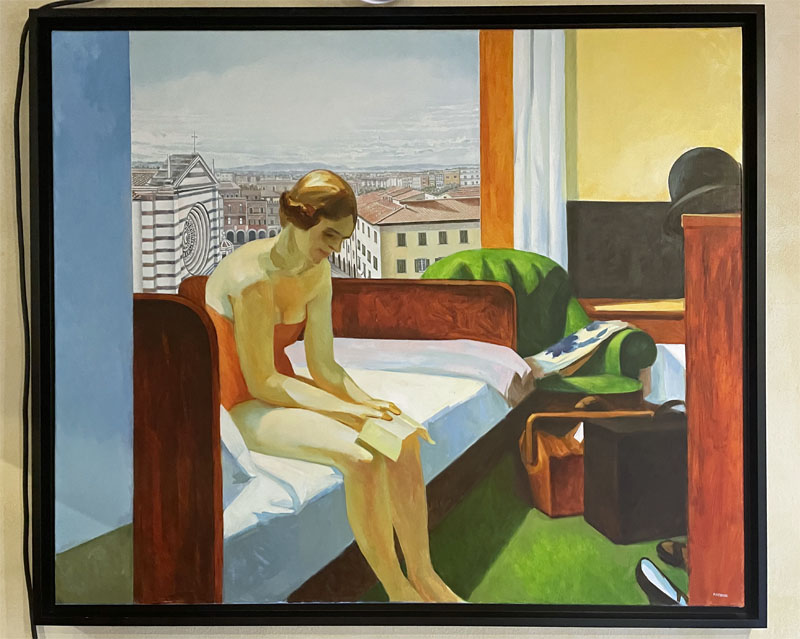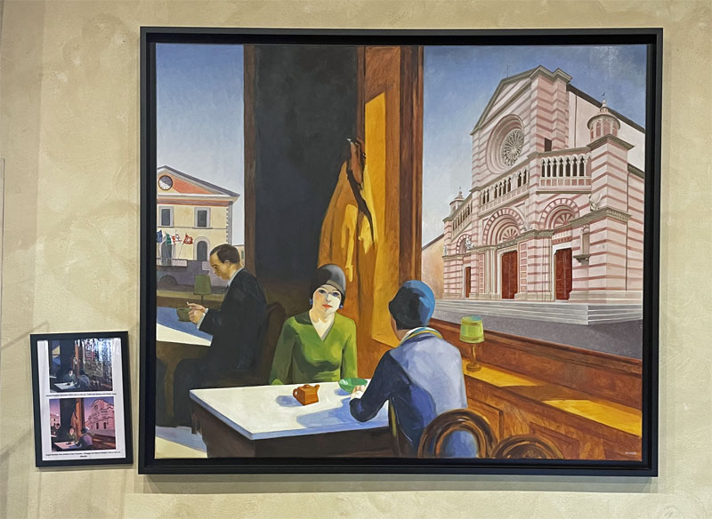 Alle pareti ecco i quadri di Sergio Nardoni, della collezione “A spasso con Edward Hopper per Grosseto e provincia”, voluta qualche anno fa da Ticci Antiquariato: le location della città “inserite” nelle opere più famose del celebre pittore americano. Uno dei più grandi artisti del ‘900. Il pittore della solitudine, ma anche del realismo, dei colori, delle meravigliose case novecentesche affacciate sull’oceano.