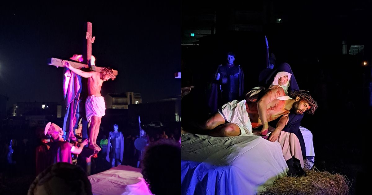 La Passione è poi proseguita per via Montebello con la caduta di Gesù e la crocefissione nel prato dietro Santa Maria Goretti, con l’impiccagione di Giuda nel parcheggio della chiesa per finire con la resurrezione sempre nel salone della chiesa di Santa Maria Goretti. I canti sono stati animati dal coro parrocchiale e dai fedeli.