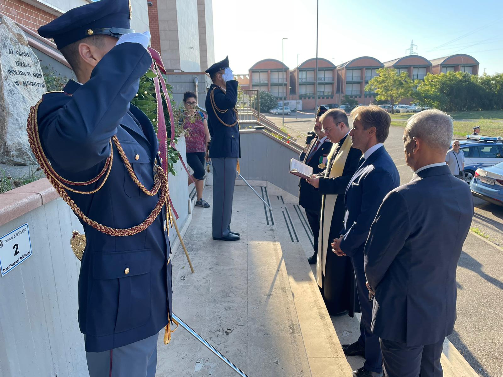 Sulla piazza dedicata all’onorato poliziotto nato a Montella, si affaccia la questura di Grosseto. E proprio sulla scalinata della questura, sotto al cippo in onore e memoria ai caduti della polizia di Stato, il questore di Grosseto, Antonio Mannoni, ha deposto una corona d’alloro, insieme all’Associazione nazionale della polizia di Stato (A.n.p.s.) e al parroco per la benedizione.