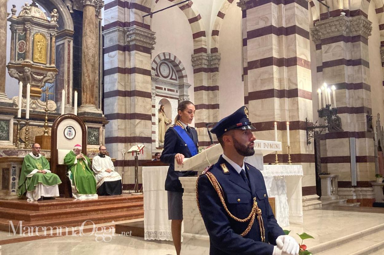 GROSSETO. Il 29 settembre la Polizia di Stato celebra l’annuale ricorrenza del suo santo patrono, San Michele Arcangelo. La cerimonia si è svolta domenica alle 9 in piazza Palatucci davanti all’ingresso della Questura dove è stata deposta una corona d’alloro al cippo in ricordo dei Caduti della Polizia di Stato e alle 11 in Duomo, dove il vescovo Giovanni Roncari, ha celebrato la messa alla presenza delle autorità civili e militari, del personale della polizia, dei familiari dei poliziotti vittime del dovere e dei caduti in servizio ed una rappresentanza della locale Associazione nazionale della Polizia di Stato.