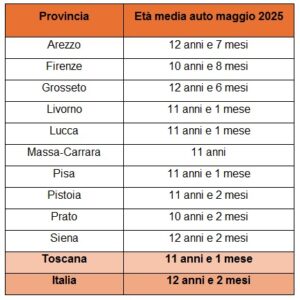 Sempre secondo l’analisi di Facile.it è 11 anni e 1 mese l’età media delle auto che circolavano sulle strade toscane a maggio 2025. L’anzianità dei veicoli toscani risulta sempre più elevata tanto che l’età media del parco auto in Toscana è aumentata del 3,6% in un solo anno.