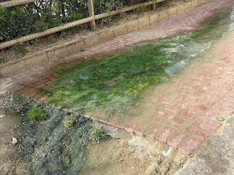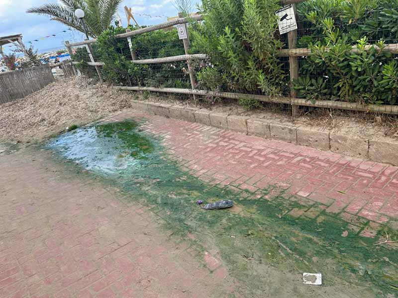 Il risultato è uno schifo, non ci viene parola migliore per descriverlo. La lunga scia d’acqua sporca finisce in spiaggia, dopo aver percorso un lungo tratto sulle mattonelle, ora coperte di muschio. I cattivi odori, peraltro con il caldo di questi giorni, sono insopportabili.