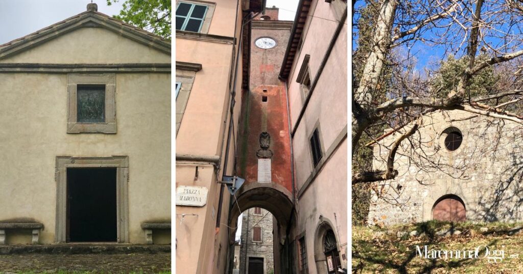 - Il percorso urbano attraversa il paese vecchio incrociando chiese e cappelle di grande interesse architettonico e pittorico da cui si può godere di un panorama affascinante sulla montagna e la campagna circostante: la chiesa di San Giuseppe o oratorio della Confraternita della Misericordia eretta nella prima metà del 1700, lungo la vecchia cinta muraria del paese, in fondo all’odierno corso Nasini; la chiesa del Santissimo Sacramento (detta chiesa piccina), la più antica, di cui si trova traccia già nella bolla di Papa Onorio III del 20 dicembre 1216. Al suo interno custodisce una madonna di Loreto in legno del 1643, lo stendardo della Compagnia del Corpus Domini con la rappresentazione dell’Adorazione del Sacramento e la Messa di Bolsena (1771) di Gioacchino Sorbelli, e la Verifica della vera Croce attribuita a Francesco Nasini. La chiesa di San Leonardo, che è la seconda chiesa costruita all’interno delle mura di Castel del Piano dopo la chiesa piccina, per accogliere la popolazione del paese in aumento. Infine, la Cappellina dell’ex ospedale.