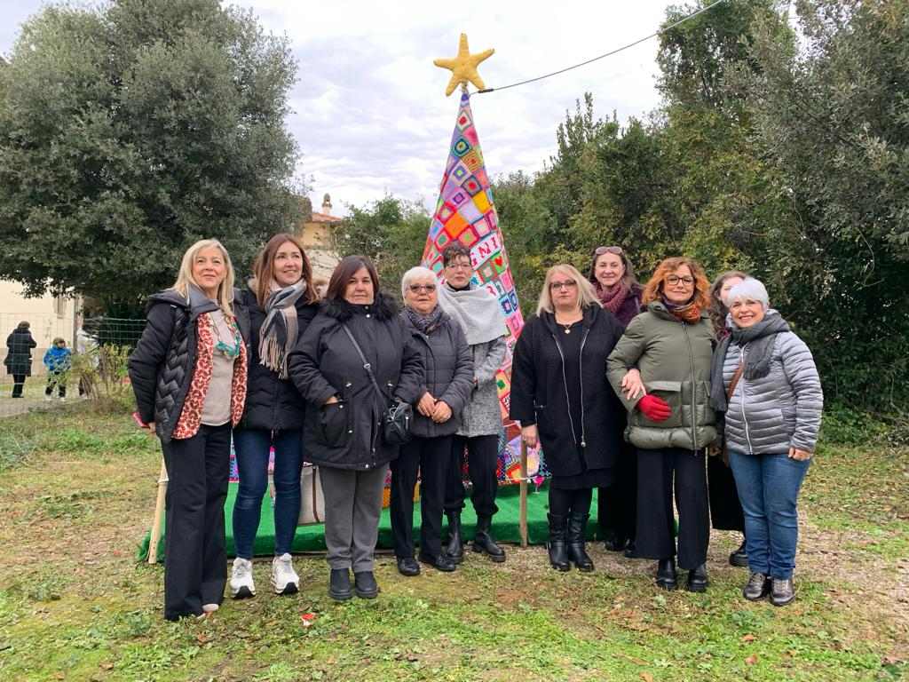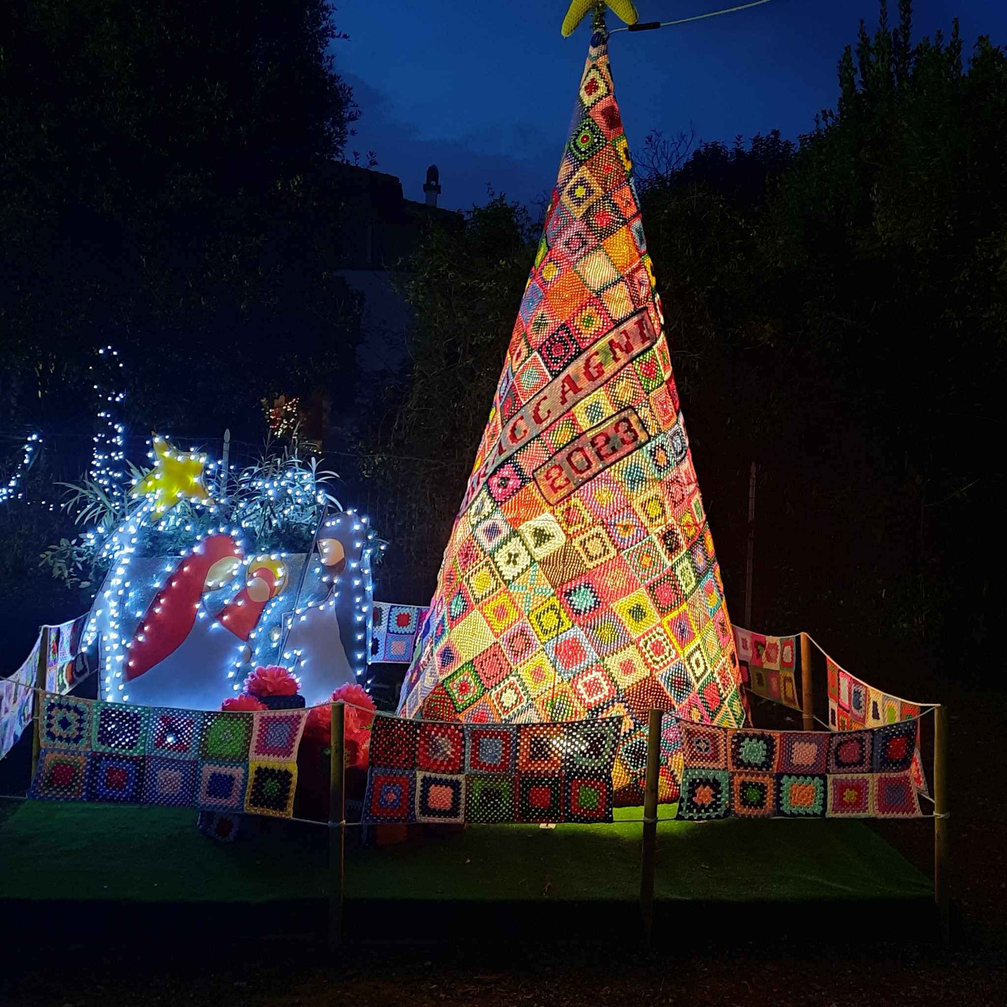 A Braccagni le donne del paese hanno realizzato un albero intessendo oltre 500 “mattonelle” realizzate a mano. Caleidoscopico di giorno, la luce interna ne rivela anche la notte, tutti i colori.