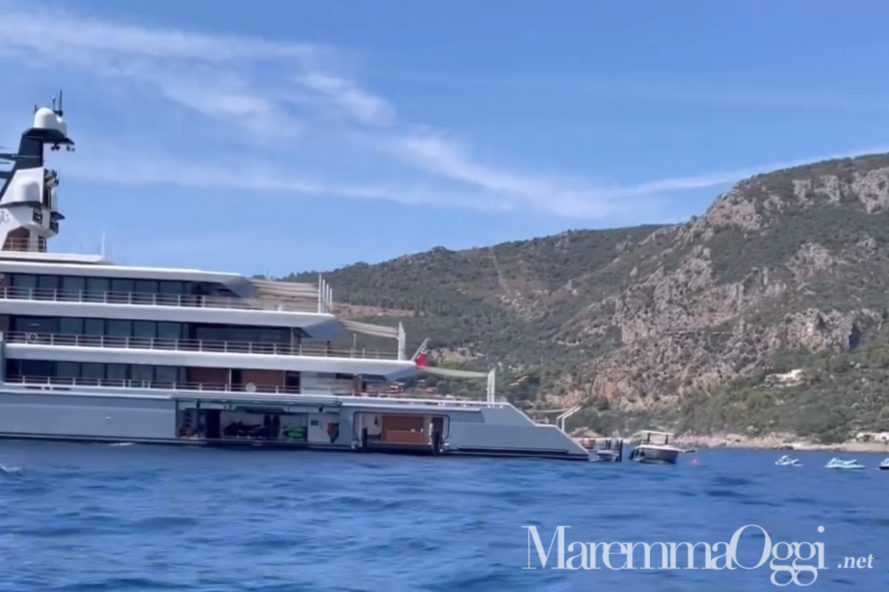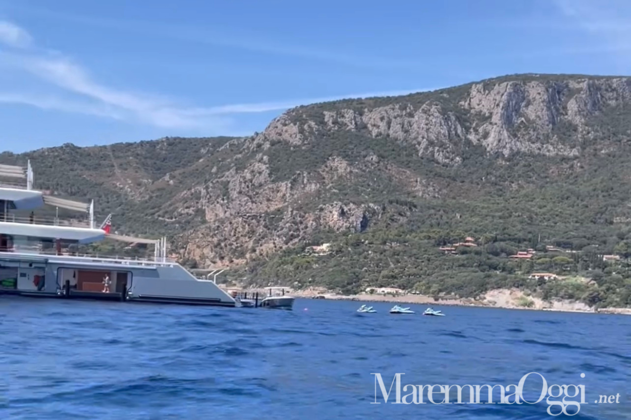Foto che sono state scattate anche da Ezio Cairoli, che pubblichiamo nella fotogallery qui sotto, che si è avvicinato al mega yacht di Steven Spielberg alla fonda di fronte la ex villa della Regina d’Olanda a Porto Ercole.