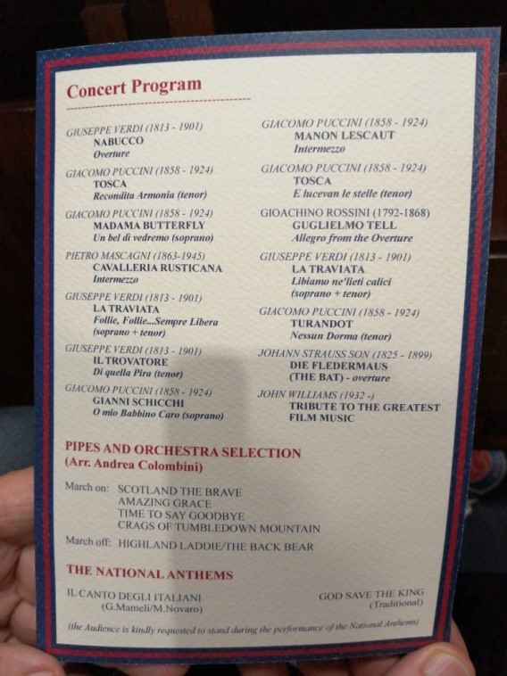 Il programma del concerto prevedeva essenzialmente musiche di Verdi e Puccini. Ai brani eseguiti dalla sola orchestra si sono alternati brani in cui l’orchestra ha accompagnato cantanti lirici, anche questi naturalmente italiani.