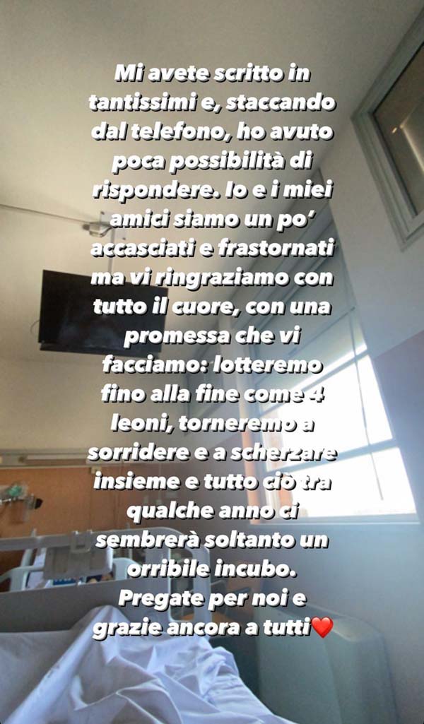 Qualche passo avanti lo ha fatto anche Giovanni, che ha un problema di liquido alle vertebre, ma che ha comunque mandato un messaggio agli amici, quando ha riacceso il telefono. Il ragazzo è ancora ricoverato ma le sue condizioni non sono gravi.