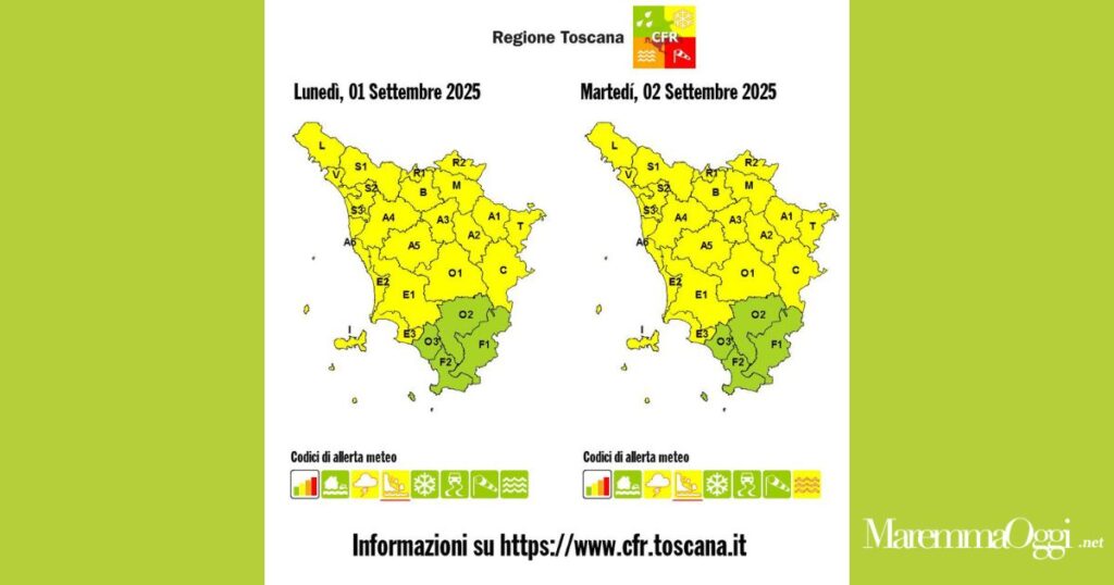GROSSETO/PIOMBINO. Ancora maltempo in arrivo sulla Toscana e la Maremma si prepara a una nuova ondata di pioggia e vento. Dalla serata di oggi, lunedì 1 settembre 2025, fino alla mattina di domani, martedì 2, è atteso il passaggio di una perturbazione che porterà rovesci e forti temporali anche sulla costa maremmana e sulla Val di Cornia.