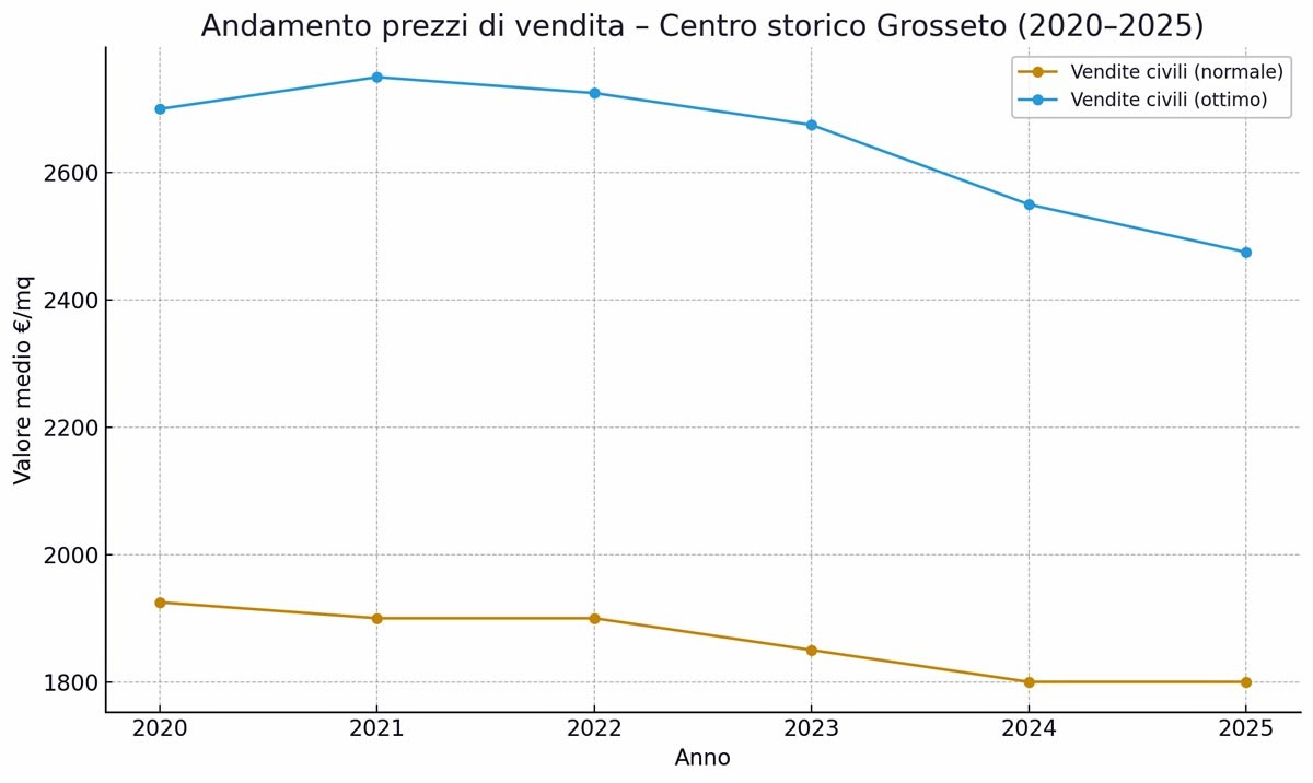 Le abitazioni civili “normali” passano da valori medi intorno ai 1.900 €/mq nel 2020–2022 ai circa 1.800 €/mq del 2024 e 2025.