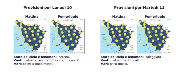 Lunedì 10 e martedì 11 situazione decisamente stazionaria, con venti deboli e assenti dai quadranti meridionali.
