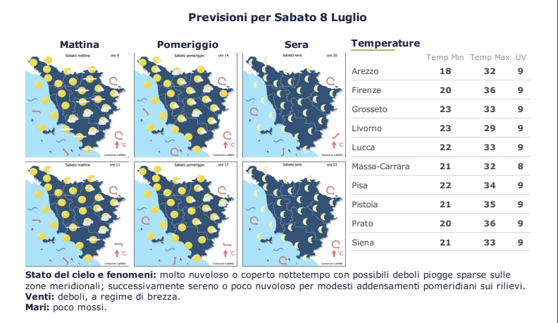 Domenica 9 ancora sarà ancora una giornata tipicamente estiva, con temperature decisamente in rialzo. Venti deboli e di direzione variabile.