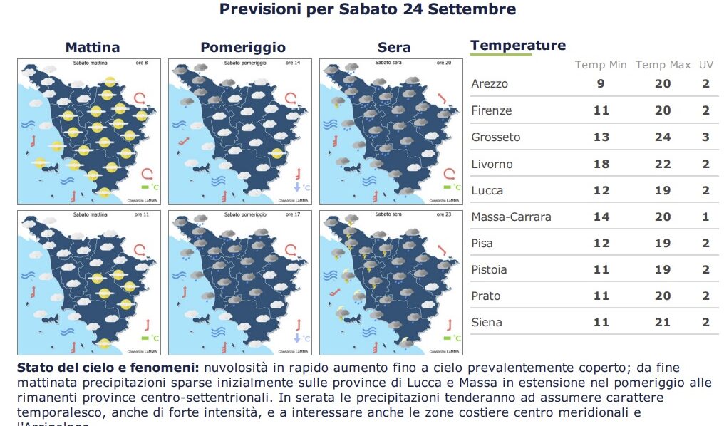 GROSSETO. Perturbazione in arrivo sulla Maremma: già da sabato sera, 24 settembre. Lo annuncia il Consorzio Lamma: il tempo cambierà rapidamente, con la nuvolosità che coprirà l’intera Toscana, dall’interno alla costa. Vento di scirocco e mari poco mossi.