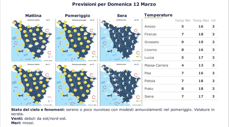 Nella giornata di domenica 12 gli annuvolamenti saranno sparsi e modesti nel pomeriggio ma il cielo rimarrà sereno su quasi tutta la Toscana.