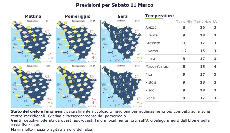 Ache per martedì 14 marzo è prevista la presenza di nubi, con un rinforzo dei venti libeccio e maestrale. I mari sono previsti mossi.