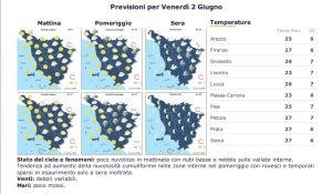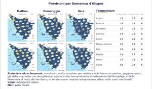 Domenica 4 giugno nuvole, anche basse, fin dal mattino con la situazione in peggioramento fino alla costa nel pomeriggio, anche con temporali, e venti dai quadranti meridionali.