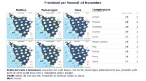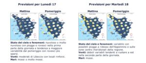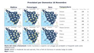 Da lunedì 17 novembre intensificazione nuvolosa fin dalla mattina, con ampia possibilità di pioggia sulla costa e nelle zone interne nella prima parte della giornata. In miglioramento dal pomeriggio. Venti di libeccio, mari molto mossi. In miglioramento nel livornese martedì 18 novembre, mentre sulla costa della Maremma prevista pioggia anche nelle zone interne. Venti in rotazione da est, mari mossi.