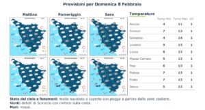 Ancora molto nuvoloso o coperto per domenica 8 febbraio, con alta probabilità di piogge sulla costa, per poi raggiungere le zone interne nella serata. Venti di scirocco. Mari mossi. Temperature stazionarie.