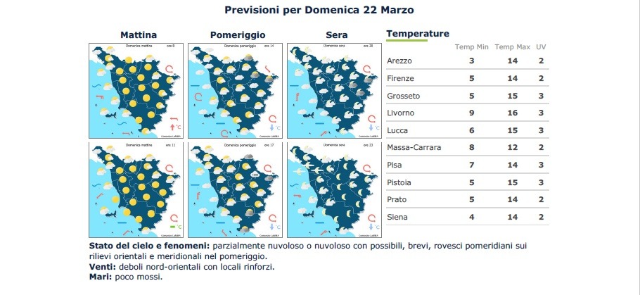Risveglio con il sole domenica 22 marzo, con nuvolosità in aumento dal pomeriggio. Venti deboli dai quadranti orientali. Mari poco mossi. Temperature stazionarie.