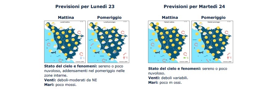 Miglioramento lunedì 23 marzo con qualche addensamento previsto nelle zone interne. Venti deboli da nord-est, mari poco mossi. Sereno o poco nuvoloso per martedì 24 marzo. Venti deboli variabili, e mari poco mossi.