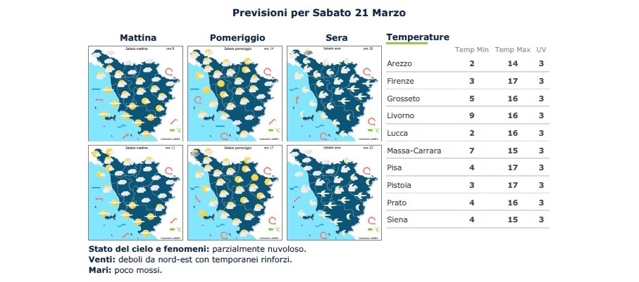 Cielo velato per sabato 21 marzo. Venti deboli da nord-est con temporanei rinforzi. Mari poco mossi. Temperature stazionarie.