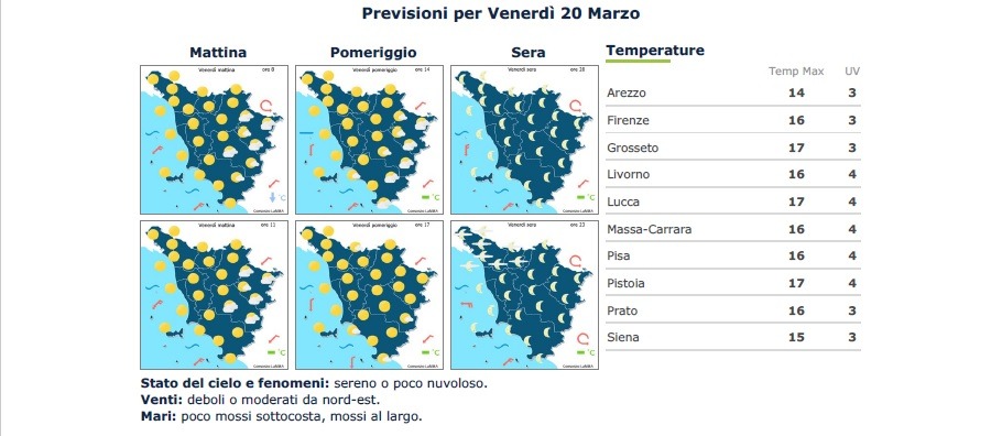 Per questo venerdì 20 marzo cielo sereno per tutto l’arco della giornata. Venti deboli da nord-est. Mari poco mossi. Temperature massime fino a 17 gradi.