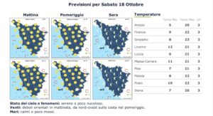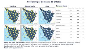 Sole anche per domenica 19 ottobre, con qualche banco di nebbia nei fondovalle e nelle pianure. Venti variabili, di maestrale nel grossetano. Mari calmi. Temperature stazionarie.
