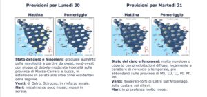 Deciso cambiamento dalla mattina di lunedì 20 ottobre, che porteranno la pioggia dal pomeriggio nel livornese. Venti dai quadranti meridionali, ostro e scirocco in rinforzo. Mari poco mossi in aumento. Molto nuvolo il risveglio di martedì 21 ottobre, sia su tutta la costa che nelle zone interne, con precipitazioni diffuse. Venti da mezzogiorno, mari molto mossi.