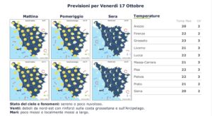 Per questo venerdì 17 ottobre, prevista una bella giornata di sole. Venti da nord-est con rinforzi sulla costa grossetana. Mari poco mossi. Temperature oltre i 20 gradi le massime.