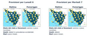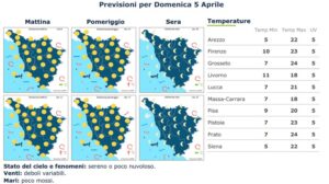 Medesime condizioni per domenica 5 aprile, con cielo sempre sereno o poco nuvoloso. Venti deboli, mari poco mossi. Temperature stazionarie.
