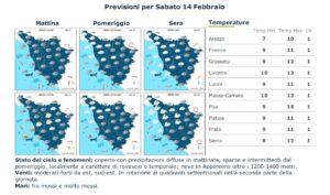 La pioggia la farà da padrone sabato 14 febbraio. Fin dalla mattina precipitazioni sparse sia sulla costa che nelle zone interne. Venti moderati da est sud-est in rotazione ai quadranti settentrionali. Mari mossi. Temperature massime in diminuzione comprese dai 9 ai 13 gradi.