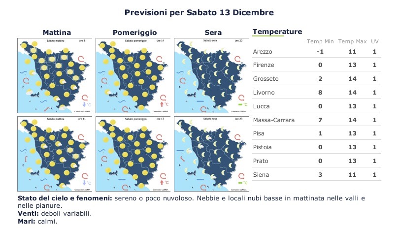 Ancora alta pressione sabato 13 dicembre con il cielo sereno o poco nuvoloso per tutto l’arco della giornata. Venti variabili, mari calmi. Temperature nel grossetano dai 2 ai 14 gradi, nel livornese da 8 ai 14 gradi.
