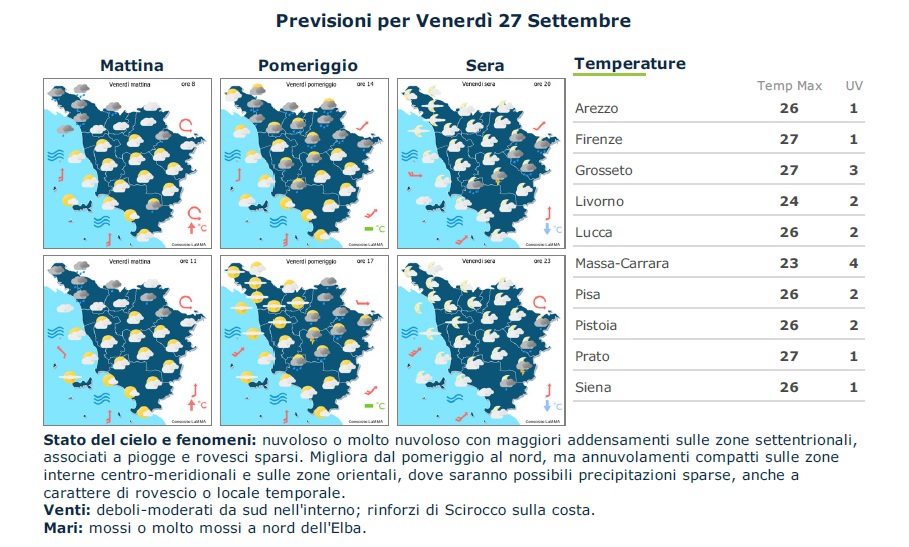 Per sabato 28 settembre cielo sereno. Temperature in leggero calo le massime con vento di libeccio in attenuazione nel pomeriggio. Mari molto mossi.
